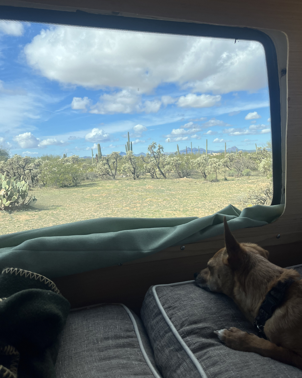 Piccolo and Able are starting to find their rhythm with van life too. Piccolo has fully accepted his role as desert lookout. Able, on the other hand, has chosen a different strategy entirely. Find the warmest spot in the van and curl up as often as possible.